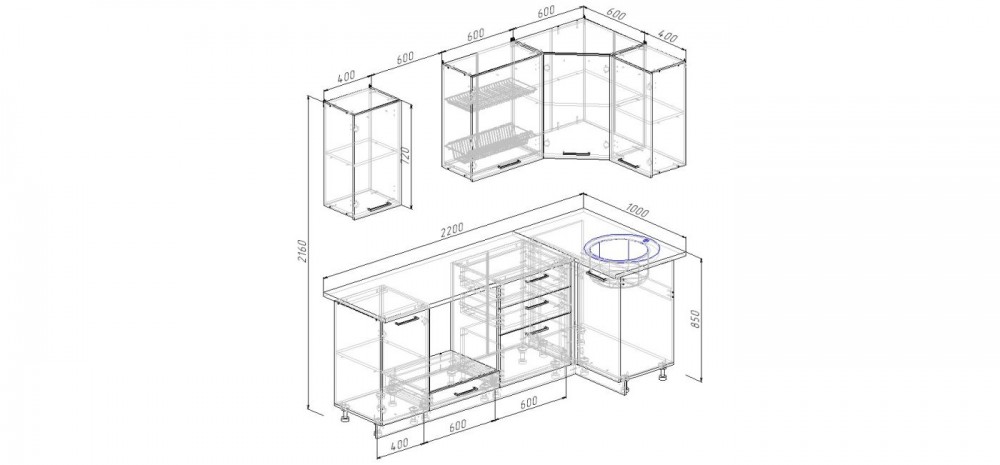 - Фасады верхних модулей со свесом – дают возможность использовать модули без установки ручек, а также установить скрытую подсветку;